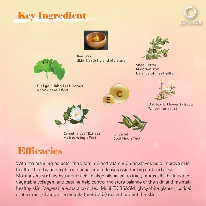 - With the main ingredients, the vitamin E and vitamin C derivatives help improve skin health. This day and night nutritional cream leaves skin feeling soft and silky.